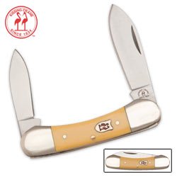 - Stainless steel blades with nail nicks for easy opening - Yellow composition handle with Kissing Crane shield - Nickel silver bolsters - Brass liners and pins - 3 3/16" closed - Kissing Crane, 5006
